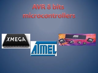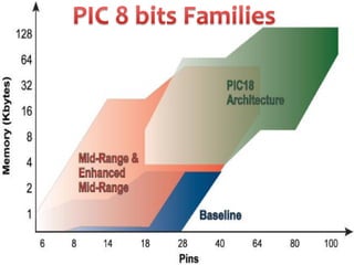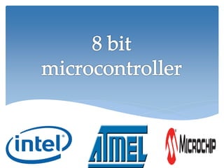 The document provides information about various 8-bit microcontrollers including the 8051, PIC, and AVR families. It discusses the original 8051 microcontroller released by Intel in 1981 and its features. It then summarizes the different members of the 8051 family and versions produced by other manufacturers like Atmel. The document also summarizes the different series within the PIC family from Microchip including the baseline, mid-range, enhanced mid-range, and PIC18 architectures. Finally, it discusses the AVR architecture from Atmel and provides details on the tinyAVR, megaAVR, and XmegaAVR families.