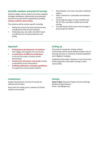 This document proposes developing climate resilient communities to improve rural livelihoods in India. It recommends developing location-specific adaptive strategies through participatory approaches. It also recommends establishing a climate change information network to empower rural communities, and building stakeholder capacity. Selected villages will be studied to develop, implement, and evaluate climate adaptive strategies to establish proof of concept for building climate resilient communities. The solutions will be context-specific and consider local catchments, crop/soil/water efficiency, diversification, and new technologies. Approaches include participatory development, public-private partnerships, and engaging women and youth. Proof of concept communities will serve as models and learning sites. Information networks will share strategies to scale up climate resilience across communities.