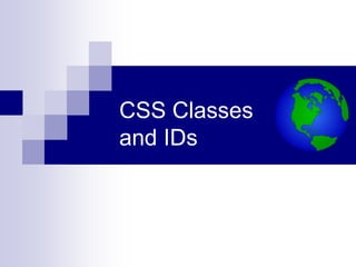 The document explains the use of CSS classes and IDs for styling specific elements on a webpage, emphasizing their differences: IDs are unique to a single element while classes can be applied to multiple elements. It provides examples demonstrating the syntax and flexibility of using classes and IDs together or separately, including how they can affect the styling outcome when conflicts arise. Additionally, it advises on best practices for naming classes and IDs to maintain the separation of content and style.