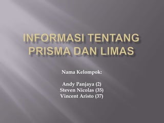 Dokumen tersebut membahas tentang limas dan prisma. Limas adalah bangun ruang yang dibatasi oleh alas berbentuk segi-n dan sisi tegak berbentuk segitiga, sedangkan prisma dibatasi oleh alas dan tutup identik berbentuk segi-n dan sisi tegak berbentuk segiempat. Dokumen ini juga menjelaskan rumus untuk menghitung luas permukaan dan volume dari limas dan prisma.