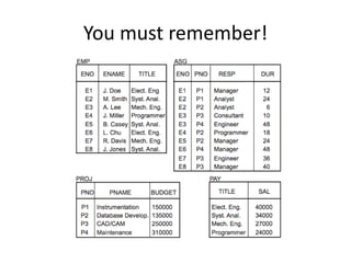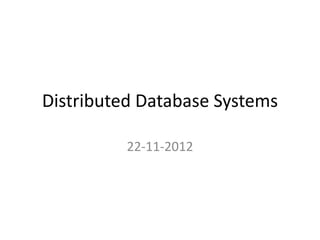 This document discusses key concepts in distributed database systems including relational algebra operators, Cartesian products, joins, theta joins, equi-joins, semi-joins, horizontal fragmentation, derived horizontal fragmentation, and ensuring correctness through completeness, reconstruction, and disjointness of fragmentations. Horizontal fragmentations can be primary, defined directly on a relation, or derived, defined on a relation based on the fragmentation of another related relation it joins with. Ensuring correctness of fragmentations involves checking they are complete, the global relation can be reconstructed from fragments, and fragments are disjoint.