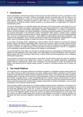 The document discusses a usability engineering methodology for e-participation platforms, particularly focusing on the 'Voice' project that aims to enhance dialogue between citizens and policymakers in the EU. It emphasizes the importance of user involvement in the iterative design process to ensure effective usability and engagement in democratic decision-making. The paper outlines the steps involved in the usability engineering lifecycle and highlights the focus on citizen participation in legislative processes, specifically in consumer protection policy.