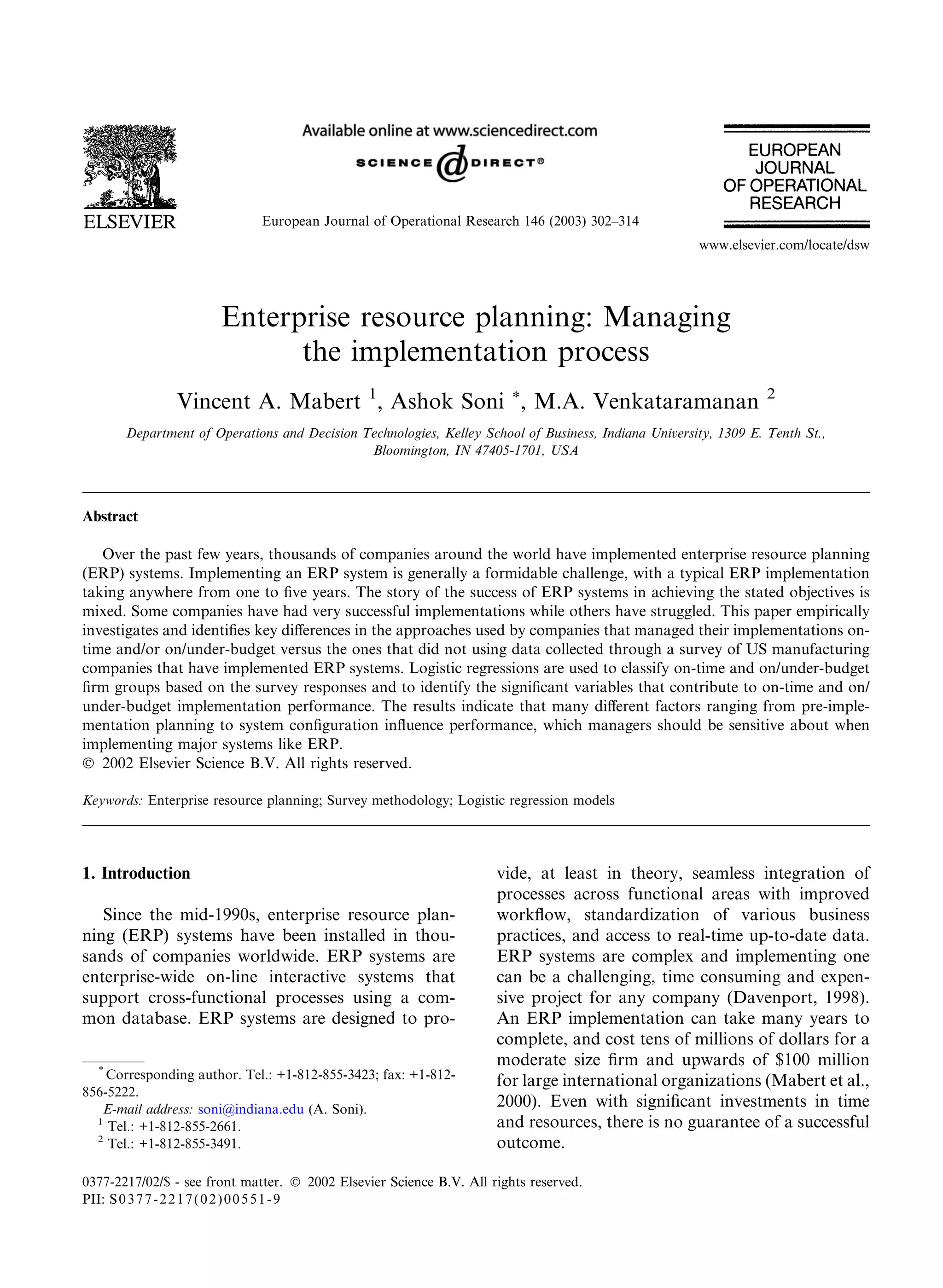 This document discusses a study that investigated factors contributing to successful enterprise resource planning (ERP) implementations, defined as being completed on time and under budget. The researchers conducted case studies of ERP implementations and identified common factors among companies that managed their projects successfully. These factors were grouped into categories of planning effort, implementation decisions, and implementation management. The researchers then conducted a survey of US manufacturing companies to validate the factors identified in the case studies and better understand their individual and collective impacts on implementation timelines and costs. Logistic regression models were used to classify companies based on whether they completed implementations on time and under budget. The results provide insights into factors that managers should consider when implementing major systems like ERP.