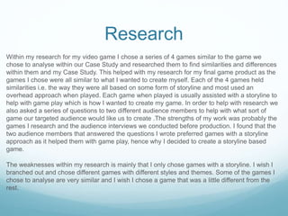 This document summarizes the research, planning, and production process for a video game project. It discusses researching similar games to serve as inspiration and learn from their similarities and differences. Audience interviews found a preference for games with storylines, so the author designed their game around a storyline. The planning process included a case study, initial game ideas, and a mood board. Production involved designing characters, terrain, houses, and trees for the game world. Feedback is provided on the game's aesthetics and how it meets the wants expressed in audience interviews.