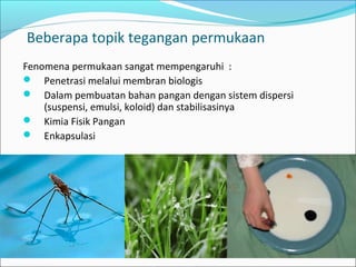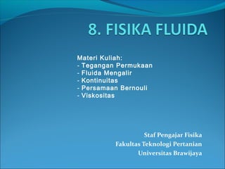 Dokumen tersebut membahas tentang materi kuliah fisika fluida yang mencakup tegangan permukaan, fluida mengalir, kontinuitas, persamaan Bernoulli, dan viskositas. Beberapa topik seperti penetrasi membran biologis dan stabilisasi emulsi dipengaruhi oleh fenomena permukaan. Asas Bernoulli menyatakan hubungan antara tekanan, ketinggian, dan kecepatan aliran fluida.