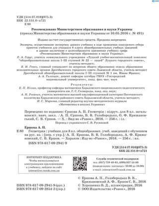 Учебник по геометрии для 8 класса включает учебный материал, контрольные задания и интернет-поддержку. Он посвящен глубокому изучению геометрических фигур, в частности четырехугольников, и включает методы доказательства и вычисления. Рекомендуется Министерством образования и науки Украины и предназначен для общеобразовательных учебных заведений.