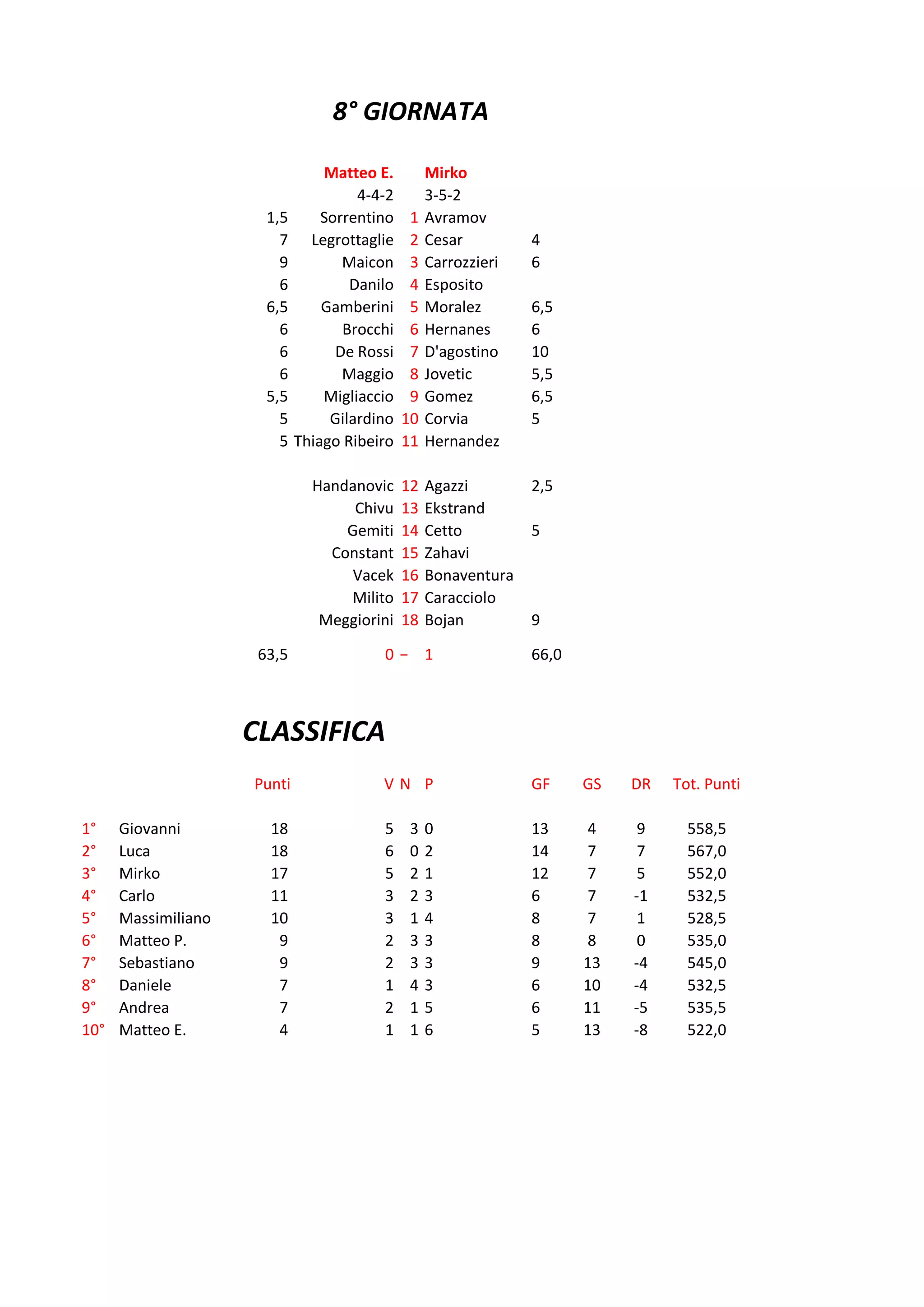 Il documento riporta i risultati e le prestazioni di una giornata di calcio con diversi giocatori e le loro valutazioni. È presente una classifica con i punti accumulati dai partecipanti, evidenziando le posizioni e i punteggi di ciascun giocatore. Giovanni si trova in testa alla classifica con un totale di 18 punti.
