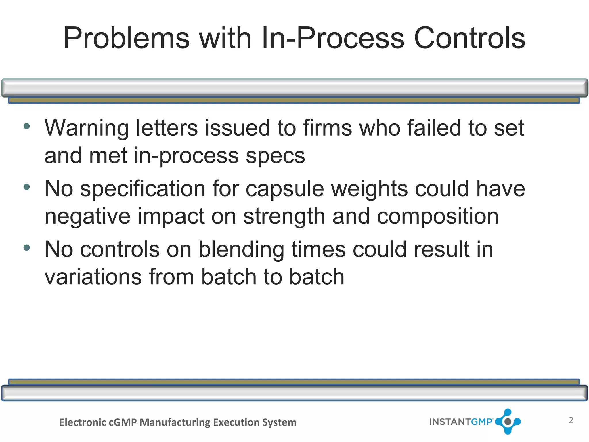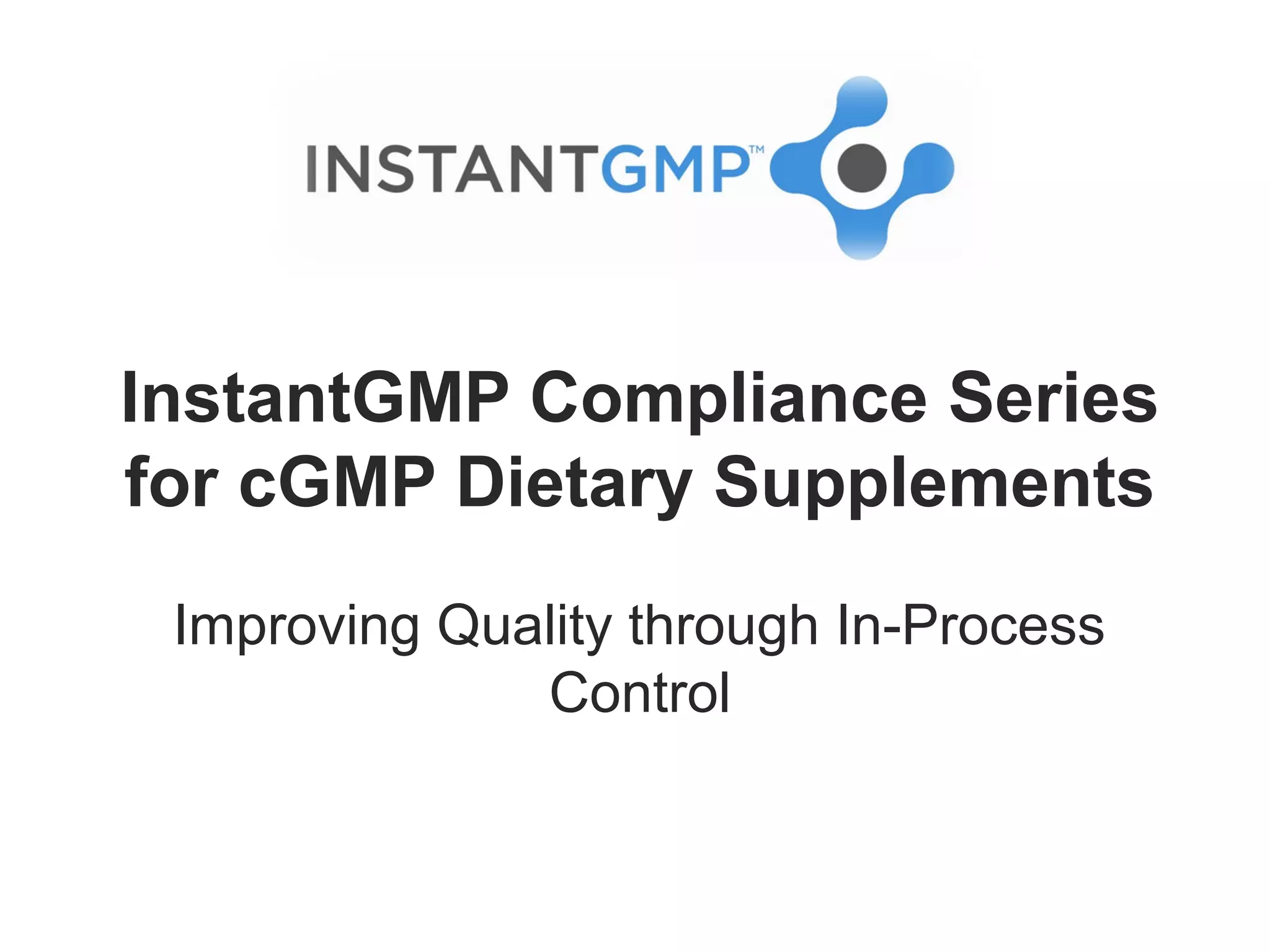 The document discusses the importance of in-process controls in the manufacturing of cGMP dietary supplements to ensure product quality, compliance, and safety. It outlines various control measures, such as specifications for raw materials, manufacturing processes, and the need to monitor deviations. Additionally, it highlights the benefits of using an electronic cGMP manufacturing execution system for improved efficiency and quality assurance.