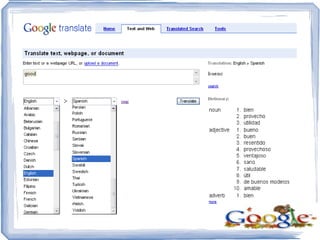 Google Translate is a beta service that translates text or web pages between languages. It has limitations on the amount of text it can translate and may not always provide accurate translations. Users can translate searches to browse foreign language results in their own language, and swap languages by clicking "swap". The user is also able to provide feedback to help improve translations over time.