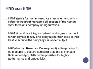 1. HRD is a subsection of HRM that focuses specifically on employee skills development and personal growth, whereas HRM deals with broader human resources functions like recruitment and compensation.