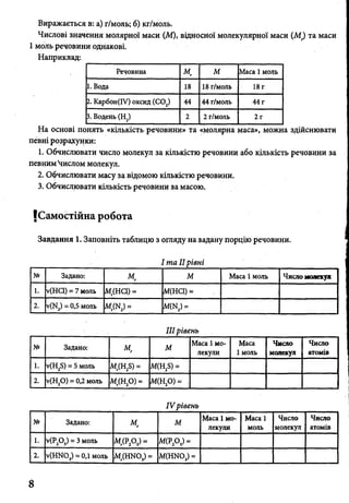 1. Ознайомитися з поняттями «кількість речовини», «моль», «молярна маса»,