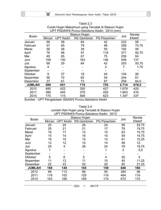 Dokumen ini menyajikan statistik cuaca di Kota Kediri tahun 2013, termasuk jumlah hari hujan, curah hujan, dan rata-rata curah hujan dari tiga kecamatan. Data juga mencakup informasi dari stasiun hujan yang menunjukkan curah hujan maksimum dan frekuensi harian hujan. Jumlah curah hujan total untuk tahun 2013 mencapai 11.703 mm, dengan variasi di setiap bulan.