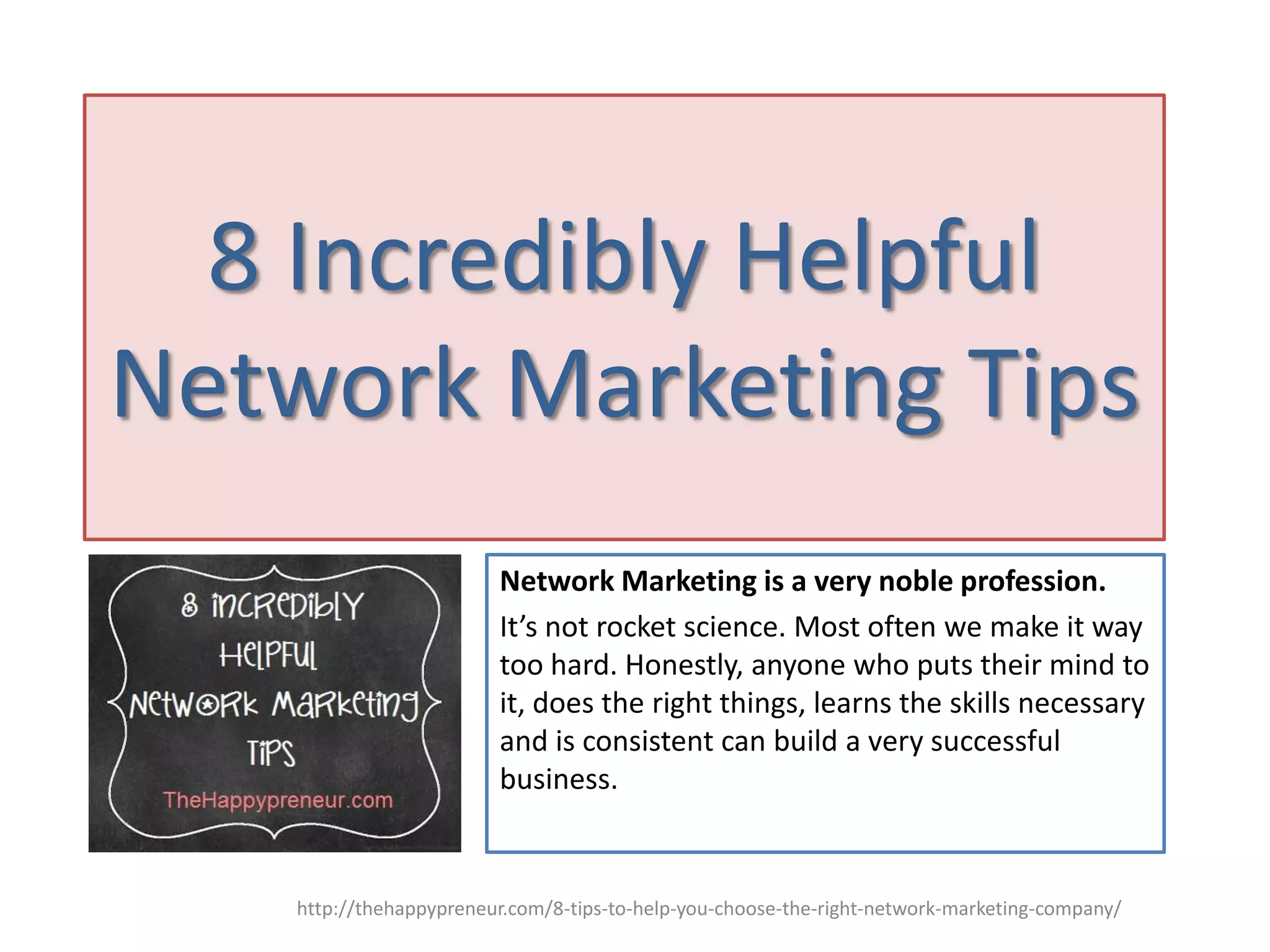 The document provides eight essential tips for success in network marketing, emphasizing that anyone can build a successful business with the right mindset and consistent effort over a few years. Key strategies include approaching potential clients confidently, developing personal skills, setting and revisiting goals, and engaging in daily business growth activities. It stresses the importance of maintaining a positive attitude and a clear understanding of one's motivations for pursuing this profession.