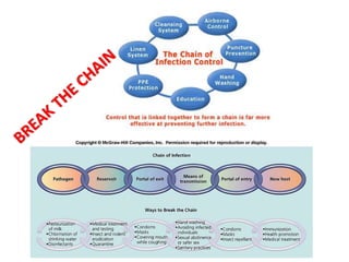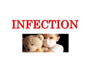 The document outlines key concepts related to infection including definitions, classifications, and principles of infection prevention. It defines infection, disease, and infectious disease and describes acute versus chronic infections. It also covers classifications such as primary/secondary infections and local/systemic infections. The chain of infection and its six links - reservoir, portal of exit, mode of transmission, portal of entry, and susceptible host - are explained. Methods of preventing infection by breaking the chain are also summarized.