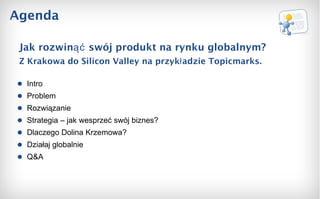 Agenda Intro ProblemRozwiązanie Strategia – jak wesprzeć swój biznes? Dlaczego Dolina Krzemowa? Działaj globalnie Q&A Jak rozwinąć swój produkt na rynku globalnym? Z Krakowa do Silicon Valley na przykładzie Topicmarks.