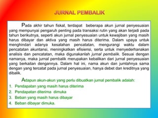 Jurnal pembalik digunakan untuk menyesuaikan akun-akun pada akhir tahun fiskal yang akan mempengaruhi transaksi rutin tahun berikutnya, seperti kewajiban dan aktiva. Jurnal pembalik memudahkan analisis dan pencatatan dengan menyederhanakan proses dan menghindari kesalahan, karena nama akun dan jumlahnya sama dengan jurnal penyesuaian, hanya debet dan kreditnya yang dibalik.