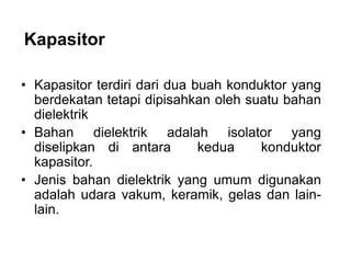 Dokumen tersebut membahas tentang kapasitansi dan dielektrik, termasuk definisi kapasitor, fungsi kapasitor, hubungan antara kapasitansi dan bahan dielektrik, serta contoh soal kapasitansi kapasitor sejajar dan paralel.