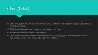 Class merupakan struktur dasar OOP yang terdiri atas field dan method. Object adalah perwujudan dari class yang memiliki atribut dan perilaku. Method mendefinisikan perilaku object sedangkan field menyimpan statusnya. Penamaan class, variable, dan method harus sesuai aturan PBO untuk memudahkan pemahaman program.