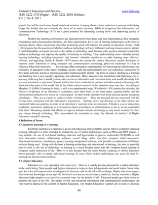 This document summarizes a study on the attitudes of higher education teachers toward e-learning. The study found that teachers with computer knowledge and who have blogs had more positive attitudes toward e-learning compared to teachers without computer knowledge or blogs. Teachers with internet access at home and school, email addresses, and computer knowledge also had higher ICT familiarity. The study recommends developing programs to foster positive attitudes among teachers toward e-learning and ICT. Overall, the findings suggest familiarity with technology is associated with more favorable views of e-learning among higher education teachers.