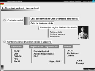 2 2.- Elcontext nacional i internacional Context mundial Crisi econòmica (la Gran Depressió dels trenta) Crisi de la democràcia Ascens dels règims feixistes i totalitaris Feixisme italià Nazisme alemany Estalinisme Context nacional: Diversitat política a Espanya Esquerres Republicans i regionalistes Dretes PSOE UGT CNT-FAI PCE POUM Partido Radical Acción Republicana ERC Lliga , PNB.... CEDA Monàrquics Carlins JONS Falange