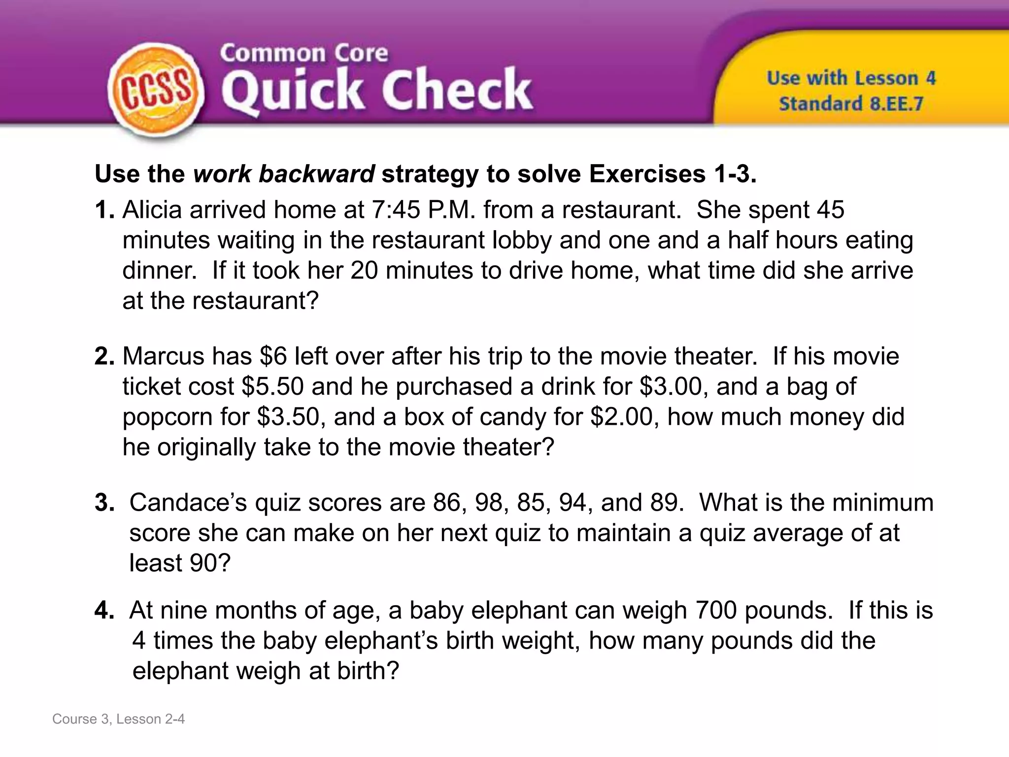 The document provides examples for solving linear equations using the work backward strategy. It includes 4 example equations with the step-by-step work shown. The answers are then provided. Additional material is included on equivalence, solving equations with variables on both sides, and using properties of equality.