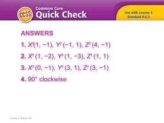 This document discusses how to find the coordinates of vertices for a triangle after various rotations and describes a quadrilateral being rotated about the origin. It provides examples of finding coordinates after a 90° clockwise rotation, 180° rotation about a point Z, 90° counterclockwise rotation about a point Y. It also discusses dilating figures using scale factors and providing examples of dilating triangles and finding the scale factor of a dilation based on diameters.