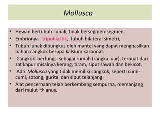 Dokumen ini menjelaskan tentang hewan moluska, termasuk ciri-ciri, klasifikasi, contoh, dan manfaat bagi manusia. Moluska terbagi dalam lima kelas, yaitu Bivalvia, Gastropoda, Cephalopoda, Scaphopoda, dan Polyplacophora, dengan karakteristik unik masing-masing. Informasi termasuk struktur tubuh, sistem pencernaan, pernapasan, dan reproduksi moluska juga dibahas secara rinci.