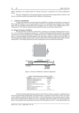 This document proposes variations to a capacitive fed suspended rectangular microstrip antenna (RMSA) configuration to achieve compact broadband and dual-band responses. Initially, a reference antenna is designed with a radiating patch and smaller feed patch above a ground plane. Measured results show an impedance bandwidth of 39%. To achieve broadband response, three slots are cut into the ground plane, extending the bandwidth to 41.9%. To achieve dual-band response, two additional slots are loaded into the radiating patch while keeping the ground plane slots. Measured results validate a dual-band response with 12.65% and 10.29% bandwidths at the lower and upper bands respectively.