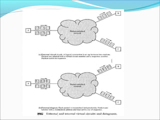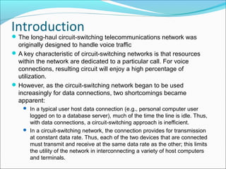 The document discusses the evolution from circuit-switching to packet-switching networks in telecommunications, highlighting inefficiencies in circuit-switching when handling data traffic. It explains packet-switching's advantages such as better line efficiency, dynamic sharing of resources, and the capability to handle different data rates between interconnected devices. Two primary packet-switching approaches, datagram and virtual circuits, are compared, detailing their operational mechanisms, reliability, and use cases depending on network design objectives.