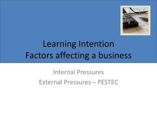 This document discusses the internal and external pressures that can impact a business. Internal pressures include new personnel, technology, finances, products, policies and culture. External pressures are categorized by PESTEC: political (e.g. laws), economic (e.g. interest rates), social (e.g. demographics), technological (e.g. internet), environmental (e.g. climate change), and competitive (e.g. market forces). It provides examples of each, such as laws restricting alcohol sales, economic recessions affecting demand, more working mothers impacting business, internet shopping changing consumer behavior, environmental concerns requiring diversification, and stores like HMV closing due to competitive pressures. Students are assigned homework to