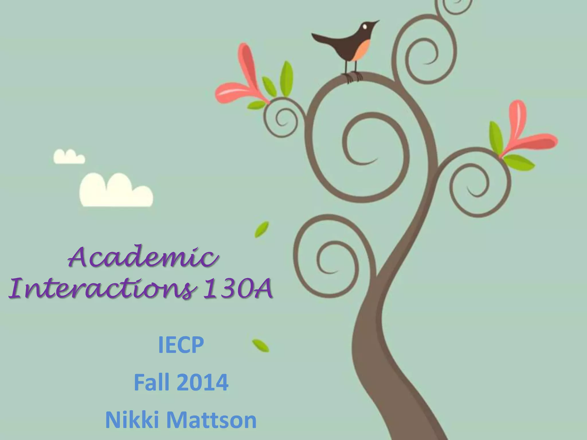 This document provides an agenda and instructions for an academic interactions class. It outlines that students will have several presentations throughout the term. It provides tips for preparing presentations and discusses useful phrases. It informs students that they will have a practice listening test the next day and that their assignment is to complete a group discussion and record it, planning a presentation on an extreme sports course, by the deadline.