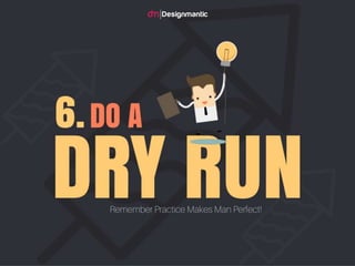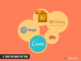 The document outlines eight essential steps for DIY design, emphasizing the importance of a detailed design brief and industry-specific color and font choices. It encourages selecting minimalistic icons and creating a toolkit for design tasks, alongside seeking peer feedback on mockups. The process promotes adaptation and improvement based on feedback to finalize a design.