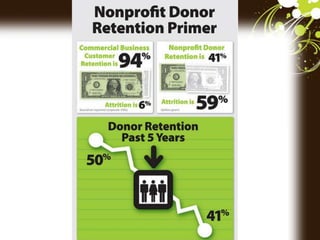 The document outlines an 8-step process to successful fundraising, emphasizing understanding the environment, defining a vision, effective communication, and engagement strategies. It highlights the importance of donor retention, stating that a 10% increase in retention can significantly boost the lifetime value of a donor. Key retention drivers include consistent communication, personalized engagement, and transparency about how donations are utilized.