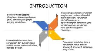 Dokumen ini membahas tentang struktur modal perusahaan, termasuk pendanaan melalui utang dan modal sendiri untuk memaksimalkan nilai perusahaan. Struktur modal yang optimal bertujuan untuk meminimalkan biaya modal keseluruhan, dengan tiga pendekatan teori struktur modal yang dijelaskan: tradisional, Modigliani-Miller, dan laba operasi bersih. Penelitian menunjukkan bahwa peningkatan leverage keuangan dapat mempengaruhi tingkat return bagi pemegang saham dan juga nilai total perusahaan.