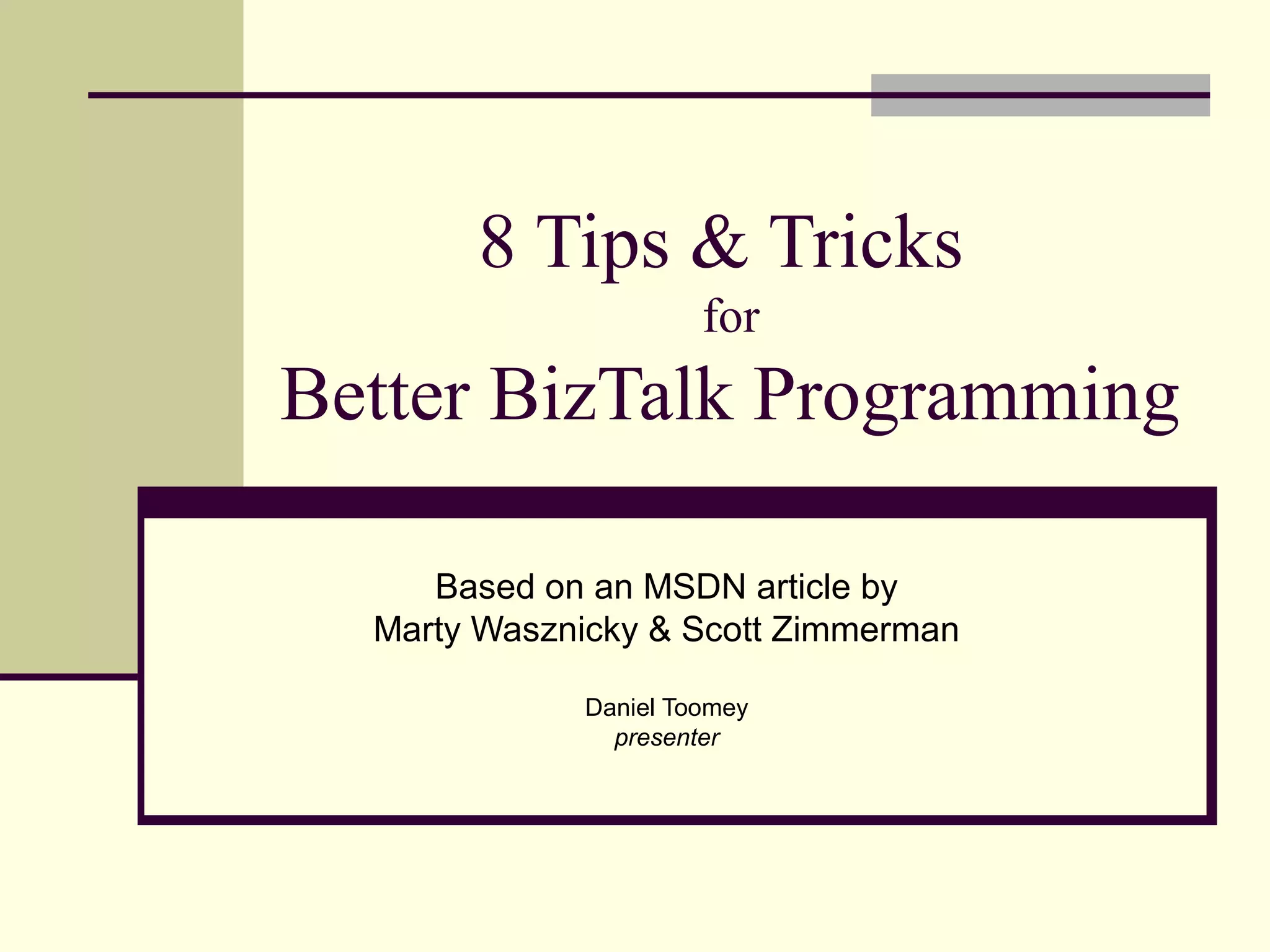 1. The document provides 8 tips for better BizTalk programming related to topics like multi-part messages, direct-bound ports, creating web services, and debugging XSLT.