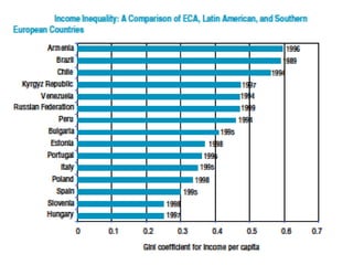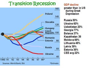 The document summarizes key economic challenges faced by post-Soviet states following the dissolution of the USSR in 1991. It discusses the recession in these countries due to factors like cuts to subsidies and declines in population income and trade. It also examines issues like high interest rates, lack of financial markets, monetary policy, defense spending cuts, and the shift from military to civilian production.