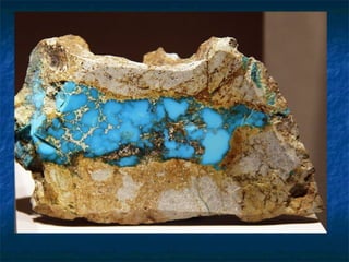 Turquoise is an opaque mineral containing copper that gives it a distinctive blue color. It has the chemical composition of hydrated phosphate of copper and aluminum. Turquoise forms in the secondary environment through the decomposition of aluminum and copper minerals in host rocks, resulting in turquoise veins. It has been valued for its attractive blue color since ancient times in cultures like Egypt and Mesoamerica.