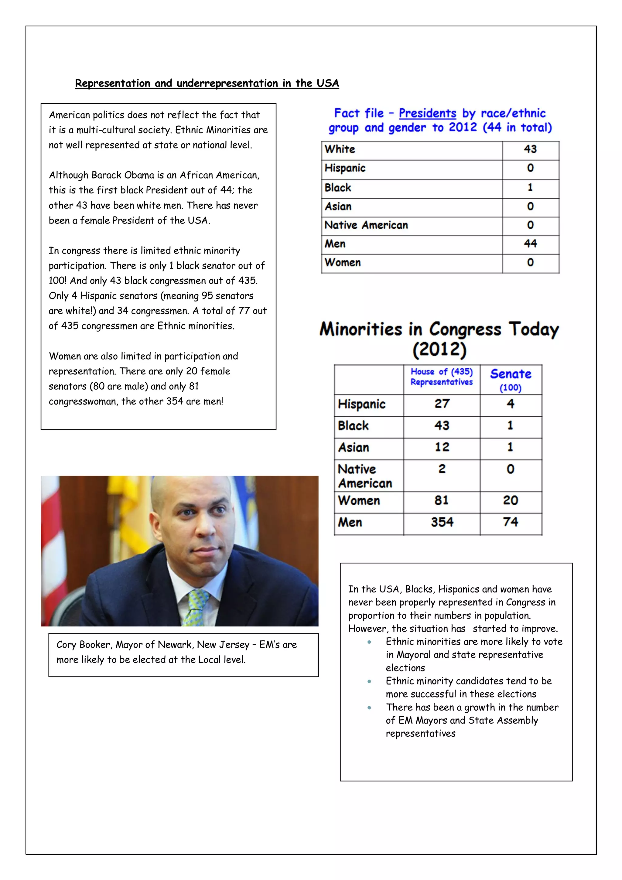 In the United States, ethnic minorities and women have historically been underrepresented in Congress compared to their proportions of the population. While Barack Obama was the first African American president, minorities make up a small percentage of members of Congress. There are only a few minority senators and congressmen. Similarly, women comprise a small minority of senators and congresswomen. However, representation of ethnic minorities has begun to improve at the local and state levels, where minorities have more success in mayoral and state legislative elections.