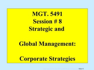 The document discusses various corporate strategies that firms can pursue in the 21st century competitive landscape, including bringing new products to market quickly, diversifying product lines, shifting product emphasis, and combining online and physical sales channels. It also summarizes strategies like the Dell model of outsourcing non-core competencies, and pursuing growth through mergers and acquisitions, international expansion, and improving core capabilities. Regionalization with local control and lean, flat organizational structures are presented as strategies for multi-national companies.