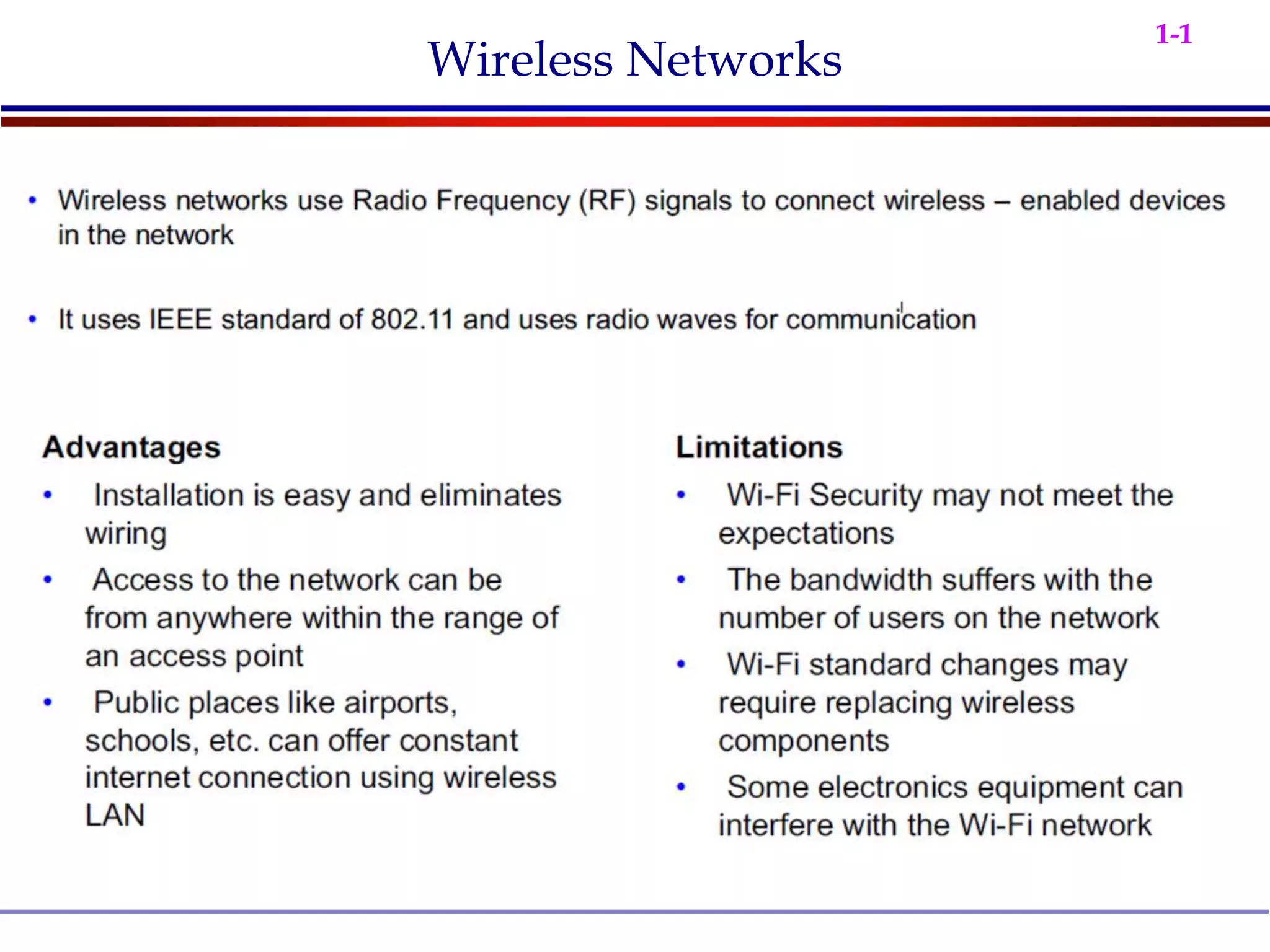 - Wireless networking standards set by IEEE including 802.11, 802.11a, 802.11b, 802.11g, 802.11n and 802.11ac.