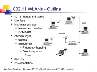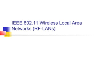 The document discusses the IEEE 802.11 wireless local area network standards, outlining the different bands, layers, frames, modulation techniques, and security implementations defined by the 802.11 specifications for wireless networks operating at speeds up to 54 Mbps using technologies like DSSS and OFDM in the 2.4 GHz and 5 GHz bands.