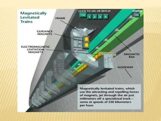 Maglev trains use magnetic levitation to lift and propel trains at high speeds without friction. There are two main types - electromagnetic suspension (EMS) which uses attractive forces, and electrodynamic suspension (EDS) which uses repulsive forces. EMS systems require external monitoring to maintain levitation distance while EDS uses superconducting magnets but requires cryogenic cooling. Both have benefits for high-capacity, high-speed transportation but EDS currently achieves the highest speeds of 581 km/h. Maglev technology has potential applications for space travel and mining in addition to passenger transit.
