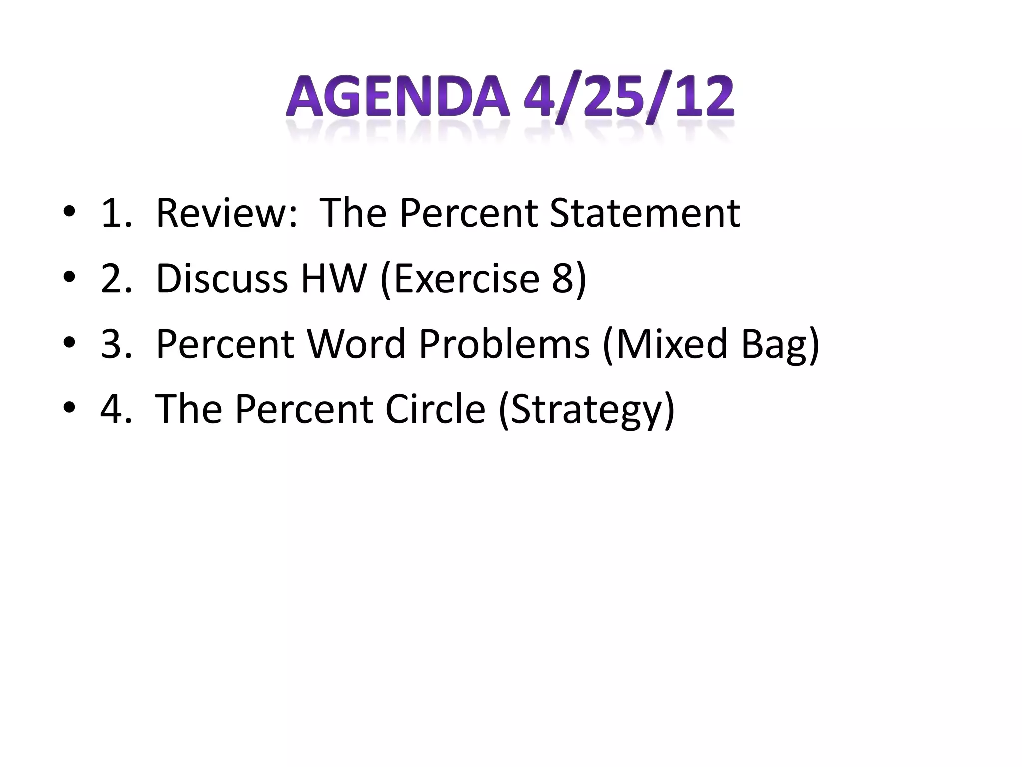 The document provides strategies and examples for solving various percent word problems. It explains how to set up and solve problems involving finding a percent of a number, finding the whole given a percent and part, and finding the percent given the part and whole. Examples include finding percentages of numbers, determining percentages of parts to wholes, and applying percentages to real-world scenarios like predicting voter turnout based on registration numbers.
