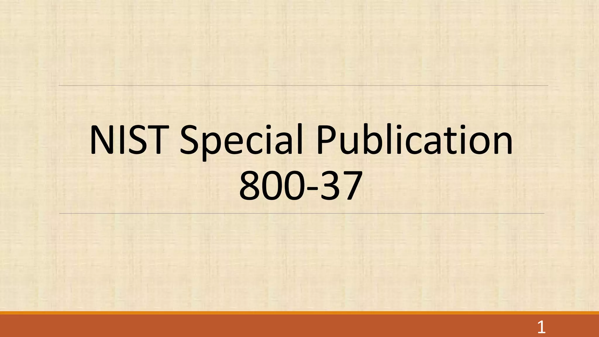 This document provides an overview of NIST Special Publication 800-37, which outlines the Risk Management Framework (RMF) for federal agencies. The RMF is a cyclical process for assessing and managing risk to systems and organizations on an ongoing basis. It includes seven steps: (1) prepare the organization; (2) categorize systems and data; (3) select controls; (4) implement controls; (5) assess controls; (6) authorize systems; and (7) monitor systems. The RMF takes a system lifecycle approach and requires coordination between information security and privacy programs to effectively manage risk.