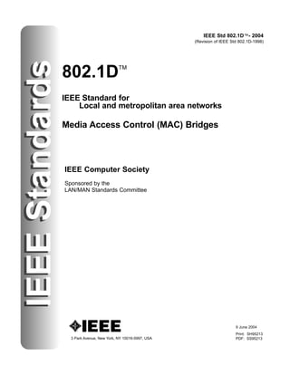 This document is a revision of the IEEE 802.1D standard for local and metropolitan area network bridges. It incorporates amendments from IEEE 802.1t and 802.1w, and makes further corrections and improvements. The standard defines the architecture for interconnecting IEEE 802 local area networks below the MAC service boundary using transparent bridges. It specifies the operation of MAC bridges to allow communication between end stations on separate LANs as if they were on the same LAN.