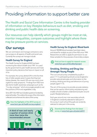 The document outlines various health and social care surveys managed by the Health and Social Care Information Centre, including the Health Survey for England, Smoking, Drinking and Drug Use survey, and the Adult Psychiatric Morbidity Survey. These surveys aim to gather data on lifestyle behaviors and health trends to inform policy and service planning. Additionally, it highlights the importance of these surveys in identifying at-risk populations and monitoring changes in health over time.