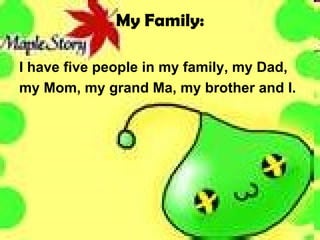 Alan is an 8-year-old boy who lives with his family of five people including his parents, grandmother, and brother. He attends the large Shinmin school and enjoys playing online computer games like Maple Story with his best friend Kenny during his free time.