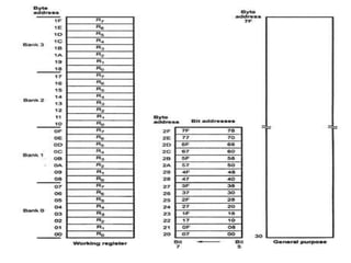 - Its internal architecture which includes CPU, RAM, ROM, registers, timers, serial port, and I/O ports.