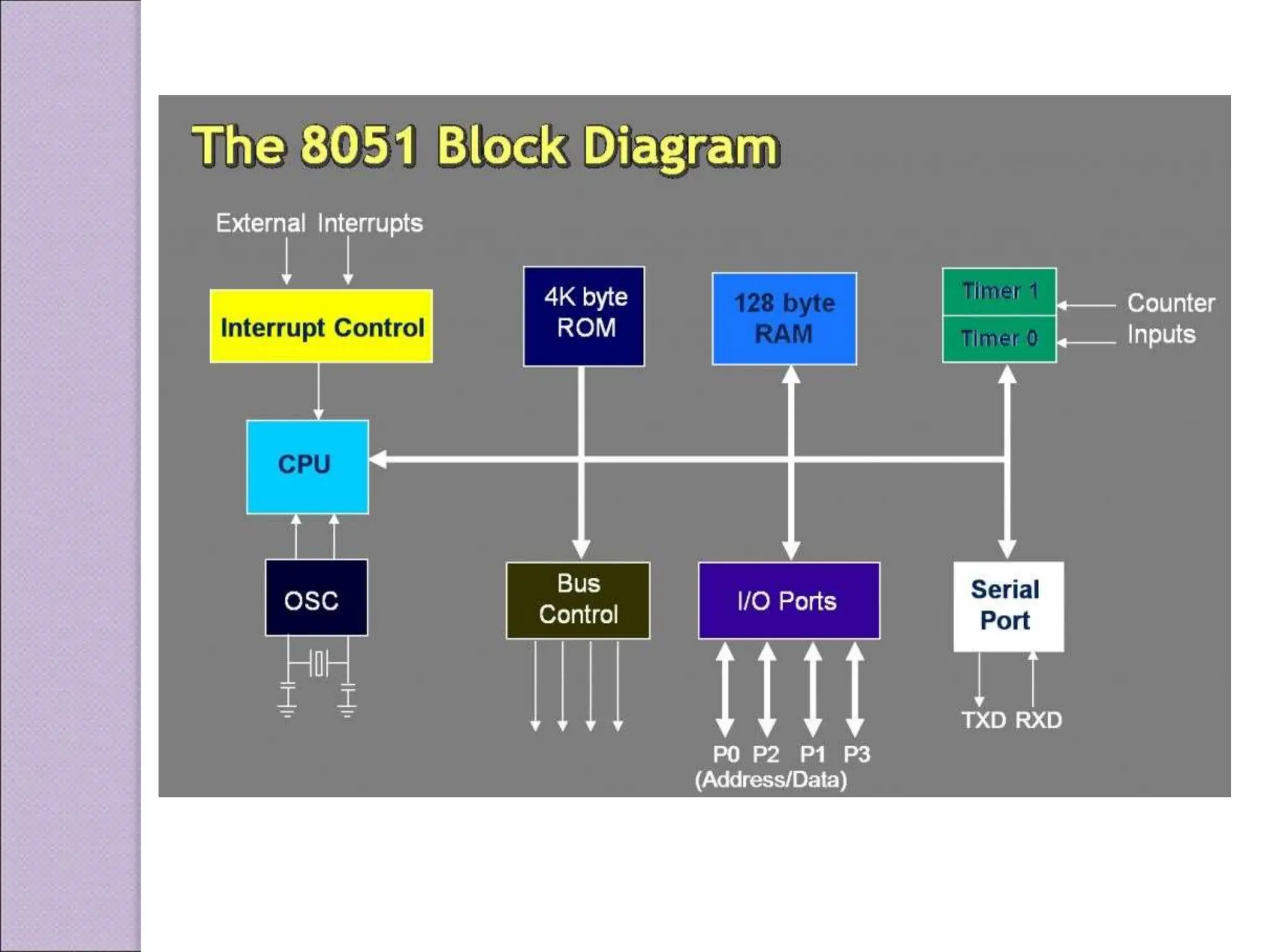 This document discusses various applications of the 8051 microcontroller. It begins by explaining the differences between microprocessors and microcontrollers, with microcontrollers being designed for special purposes with all peripherals built-in. Embedded systems are then introduced as using exclusively written software embedded in custom hardware. Common microcontrollers for embedded systems include PIC and 8051. The architecture and applications of the 8051 microcontroller are then outlined, followed by descriptions of interfacing 8051 with devices like relays, stepper motors, DC motors, and PWM generators. Programming examples are provided for some applications. Other applications discussed include traffic light controllers and washing machine controls. Interfacing the 8051 with I2C is also summarized.