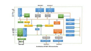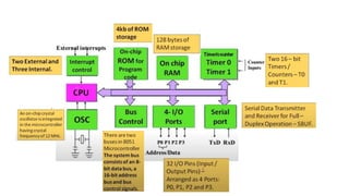 - The 8051 has features like an 8-bit ALU, 8-bit accumulator, 128 bytes of RAM, 4KB of ROM, four 8-bit I/O ports, two 16-bit timers/counters, and UART serial communication.